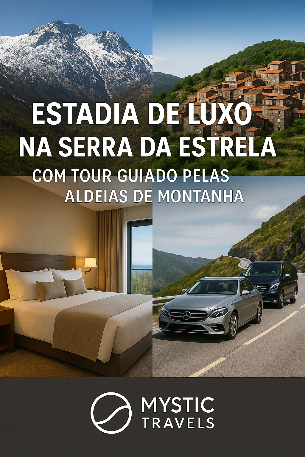 Experiência premium de 2 dias e 1 noite na Serra da Estrela, com estadia em hotel 4 ou 5 estrelas e tour guiado pelas aldeias de montanha. Inclui motorista profissional, transporte privado, gastronomia regional e opções Pack Premium ou Pack VIP Gourmet.