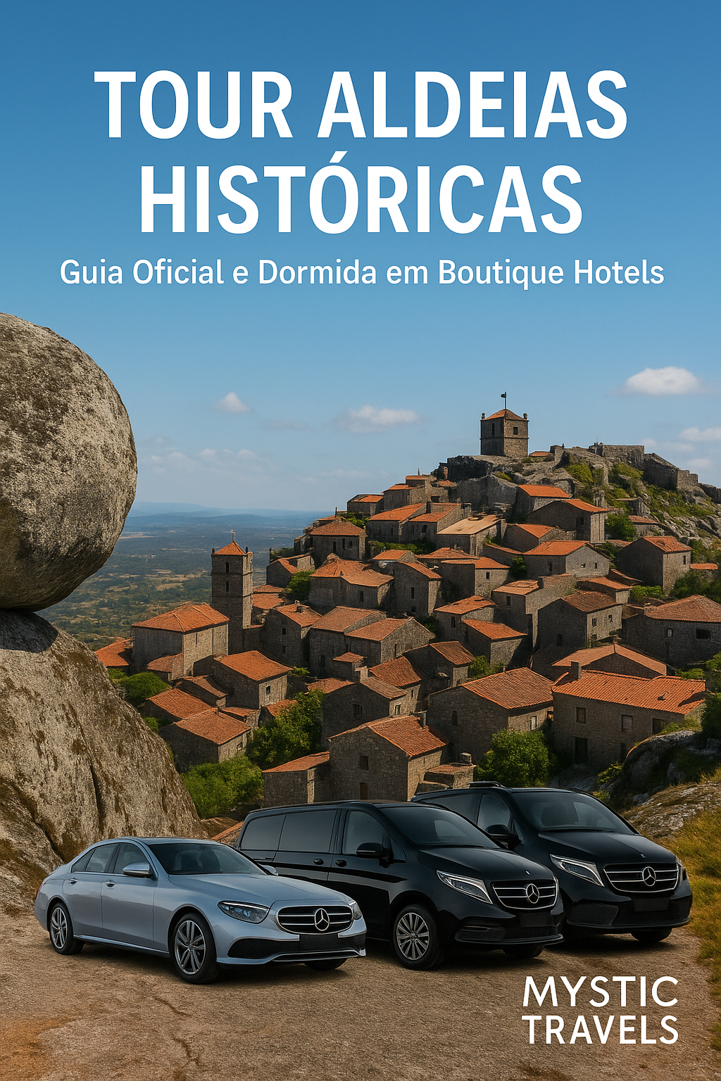 Tour exclusivo pelas Aldeias Históricas com saída do Porto, guia oficial e alojamento em boutique hotels. Explore Monsanto, Sortelha, Belmonte, Castelo Novo e Idanha-a-Velha. Disponível em PACK Premium (3 dias) e PACK VIP (4 dias). Viaturas Mercedes, gastronomia regional e experiência autêntica.